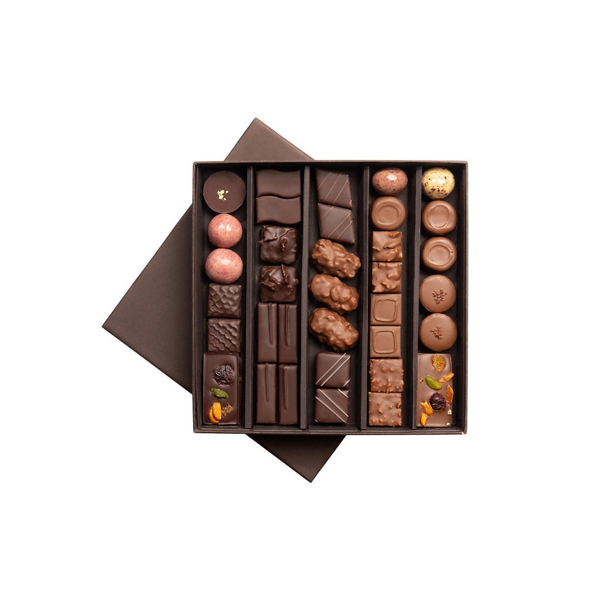 À l’intérieur, un subtil mélange de pralinés croustillantes et ganaches fondantes 100% beurre de cacao, fabriqués en France avec amour dans notre atelier. Des chocolats soigneusement choisis pour ravir tous les palais, des amateurs de chocolat noir intense aux fondus de chocolat au lait onctueux.