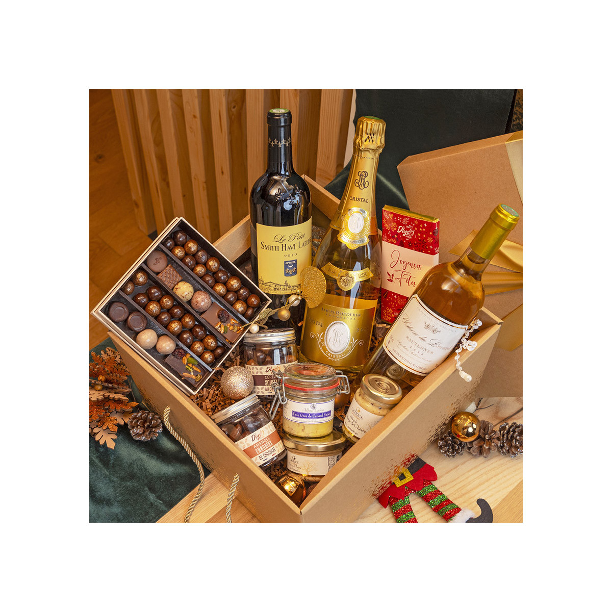 Coffret cadeau de noël avec Chocolats, Foie gras au cacao, Epicerie fine salée, Champagne Cristal de Roederer, Vin grand cru classé de Bordeaux et Vin blanc Sauternes pour un Noël chic et exceptionnel.